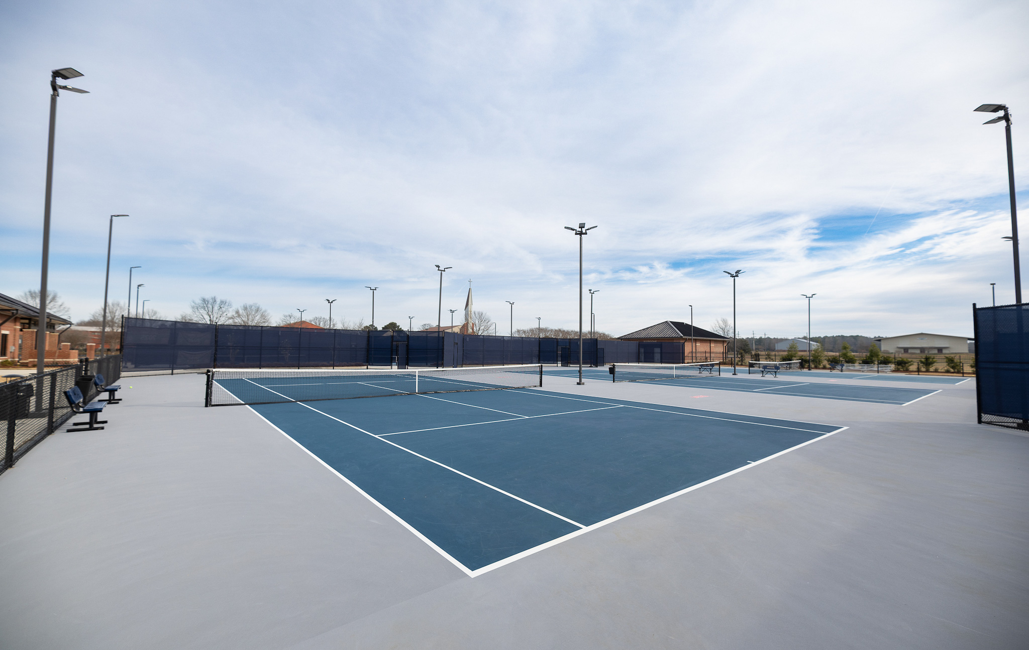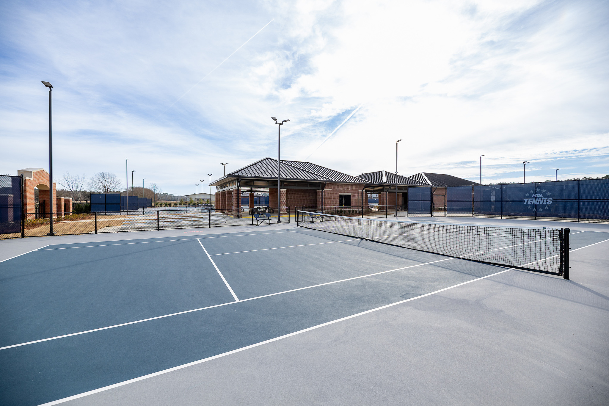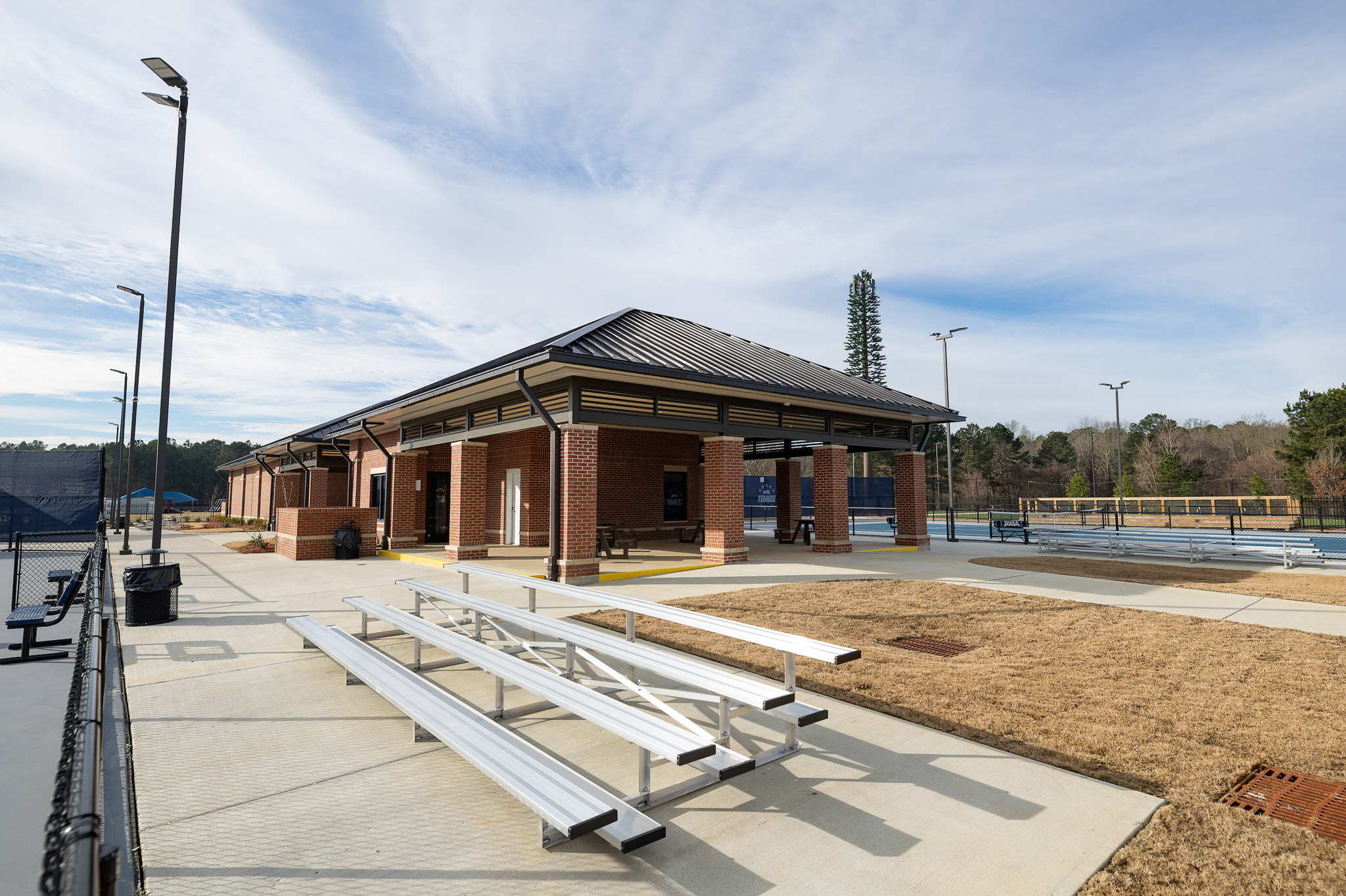 Situated on 4.35 acres, the complex features eight tennis courts—including two championship courts—within a fully lighted layout that supports both competitive events and daily use. Elevated spectator platforms and strategically positioned support facilities create clear circulation and functional efficiency across the site.