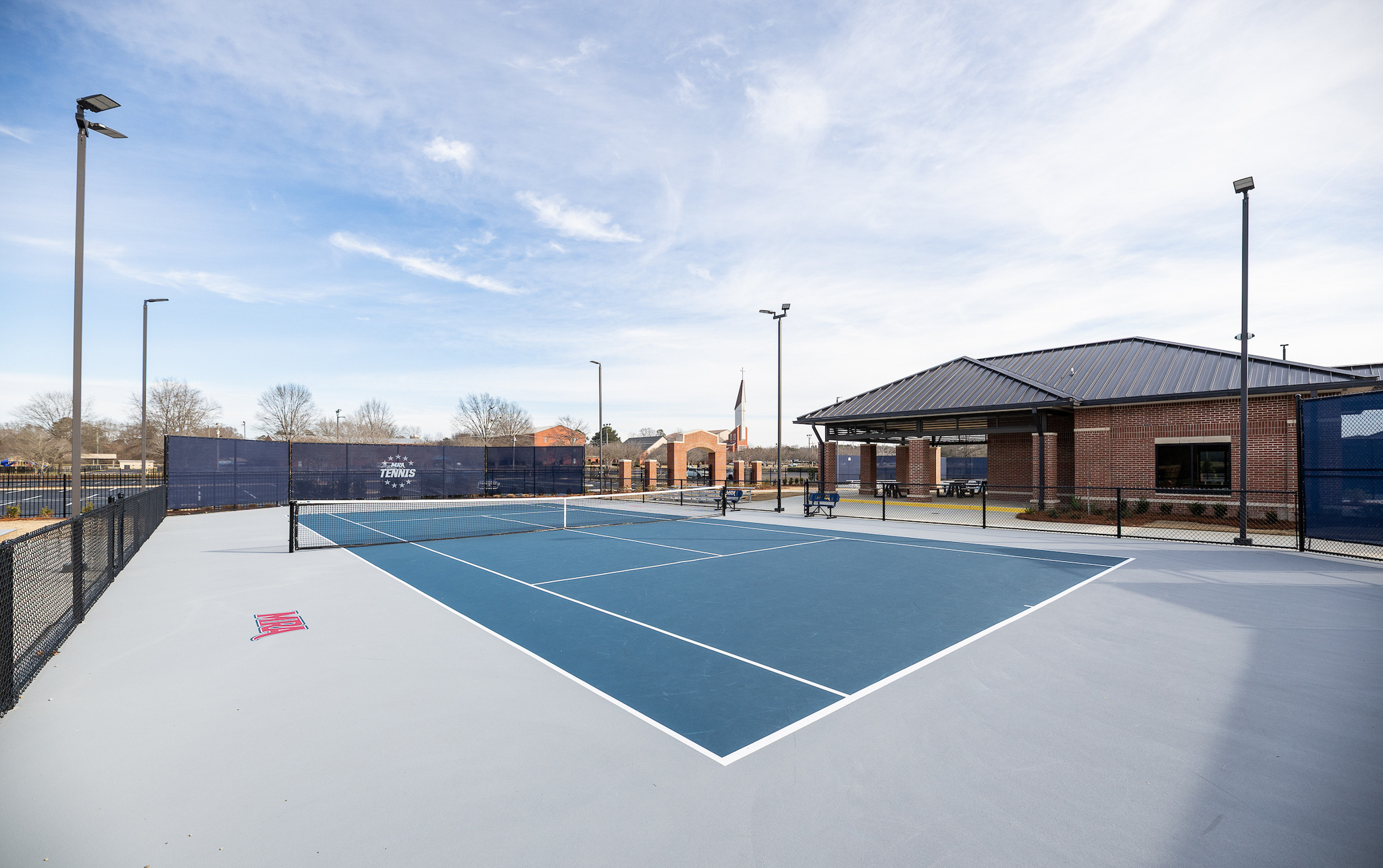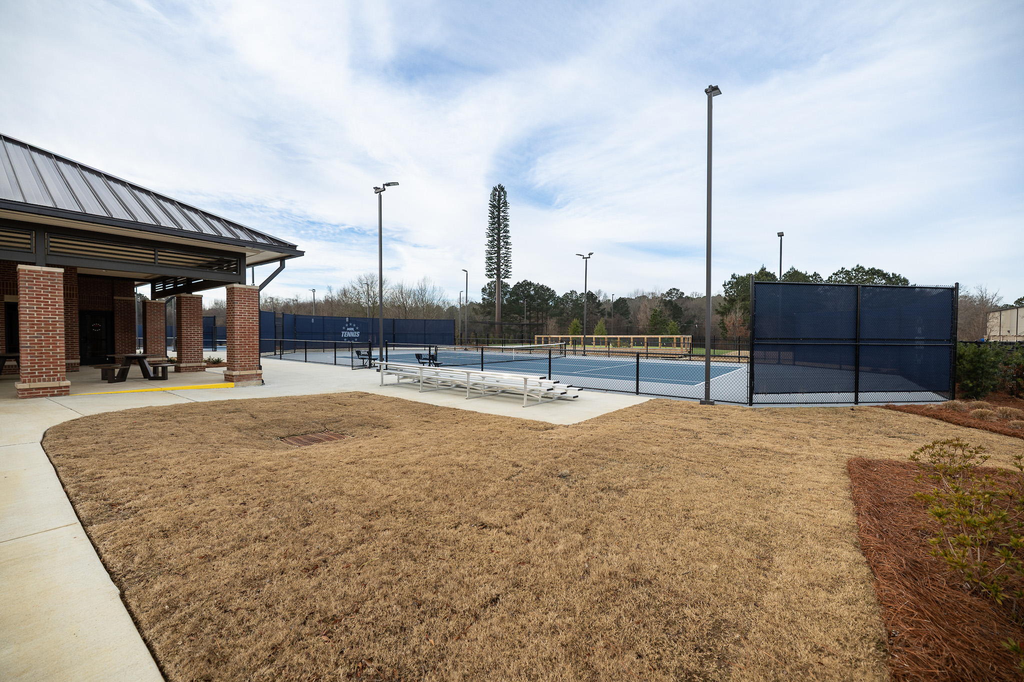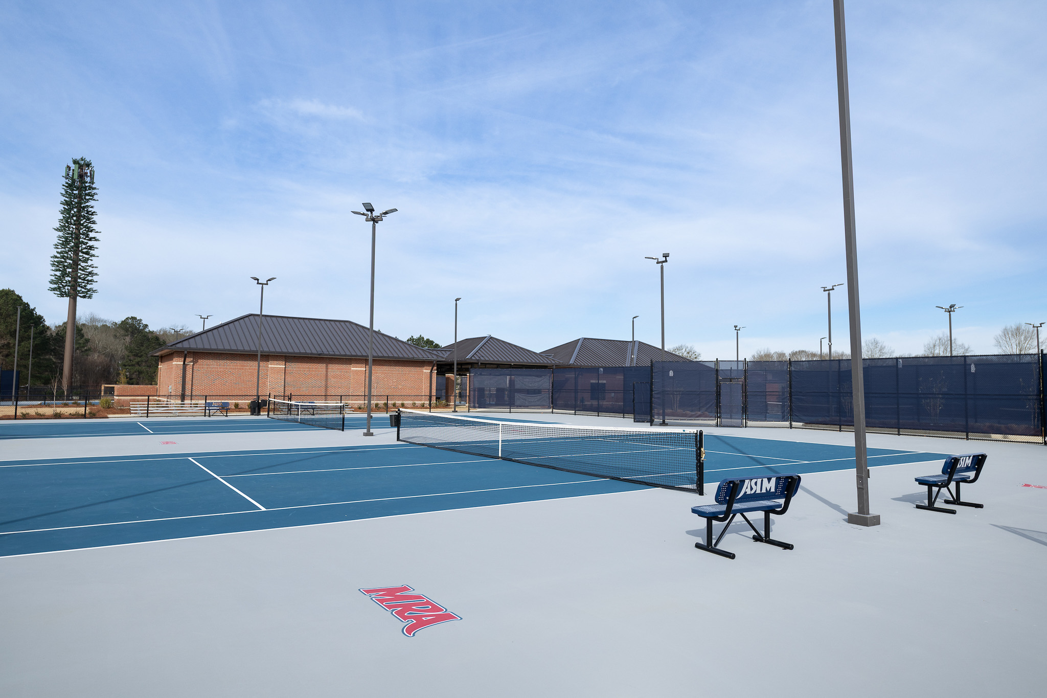 Situated on 4.35 acres, the complex features eight tennis courts—including two championship courts—within a fully lighted layout that supports both competitive events and daily use. Elevated spectator platforms and strategically positioned support facilities create clear circulation and functional efficiency across the site.