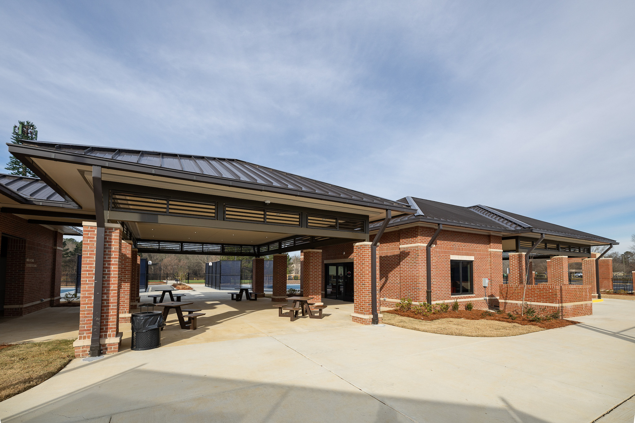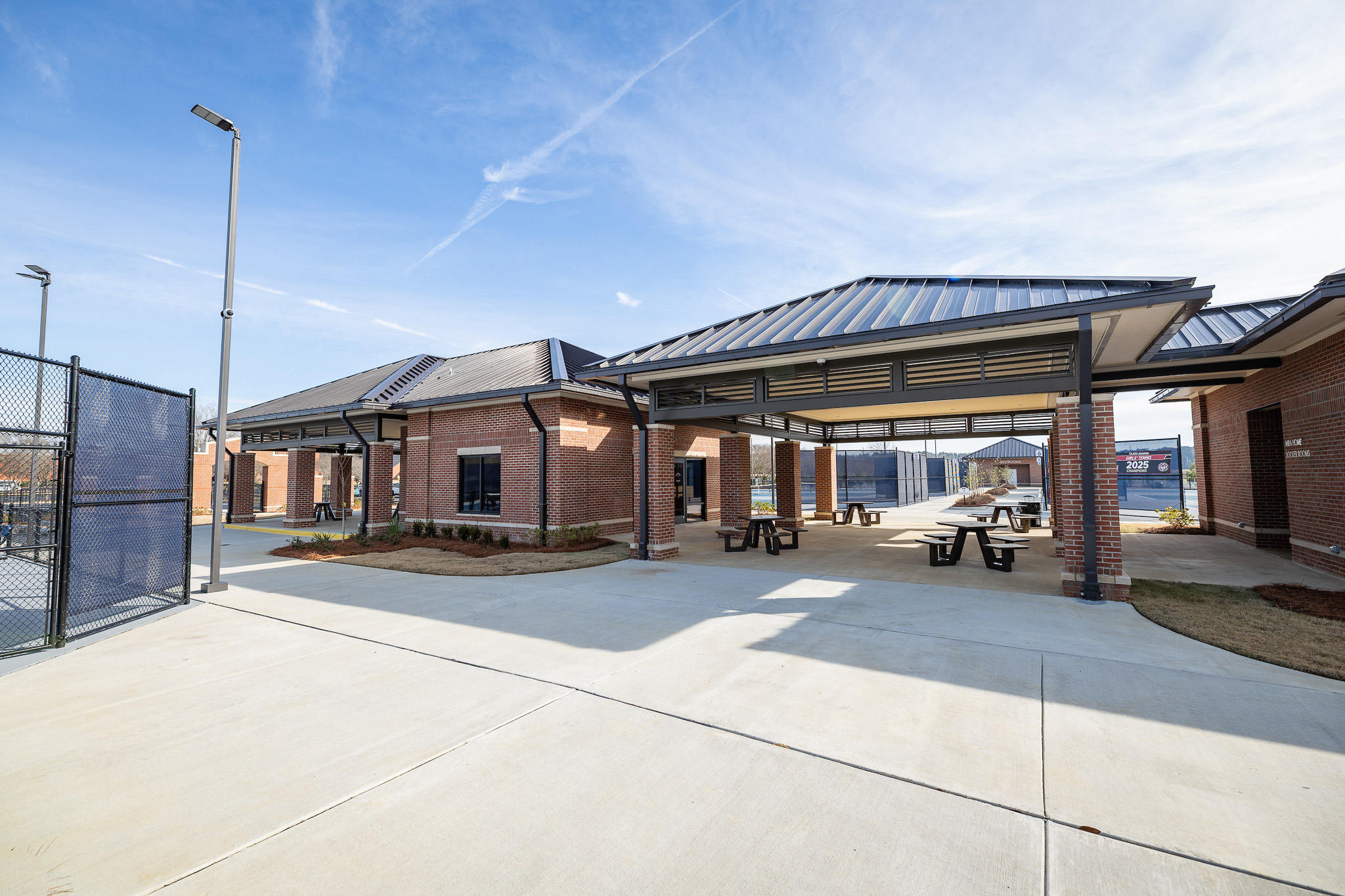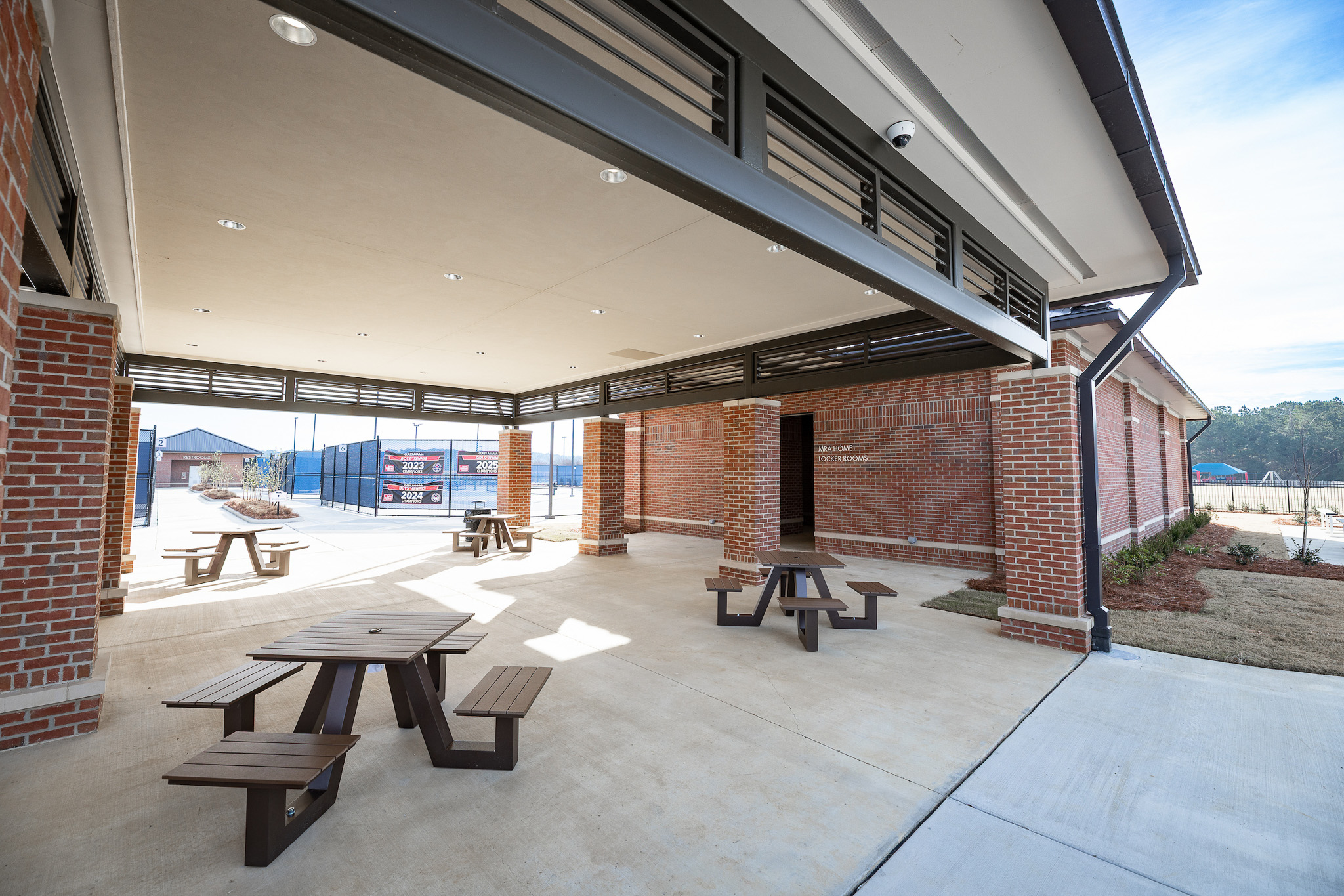 A central covered pavilion serves as the primary architectural element, physically and visually linking team meeting spaces and locker rooms while establishing a strong sense of place.