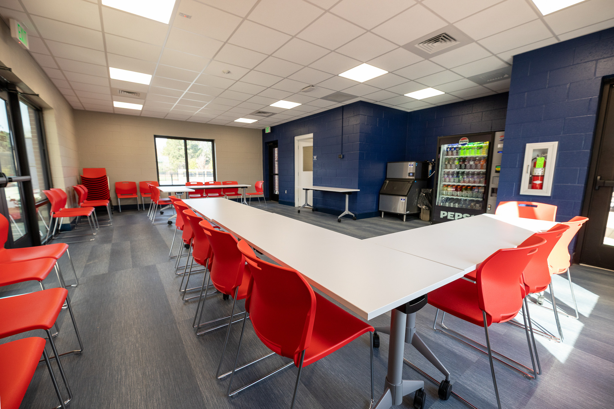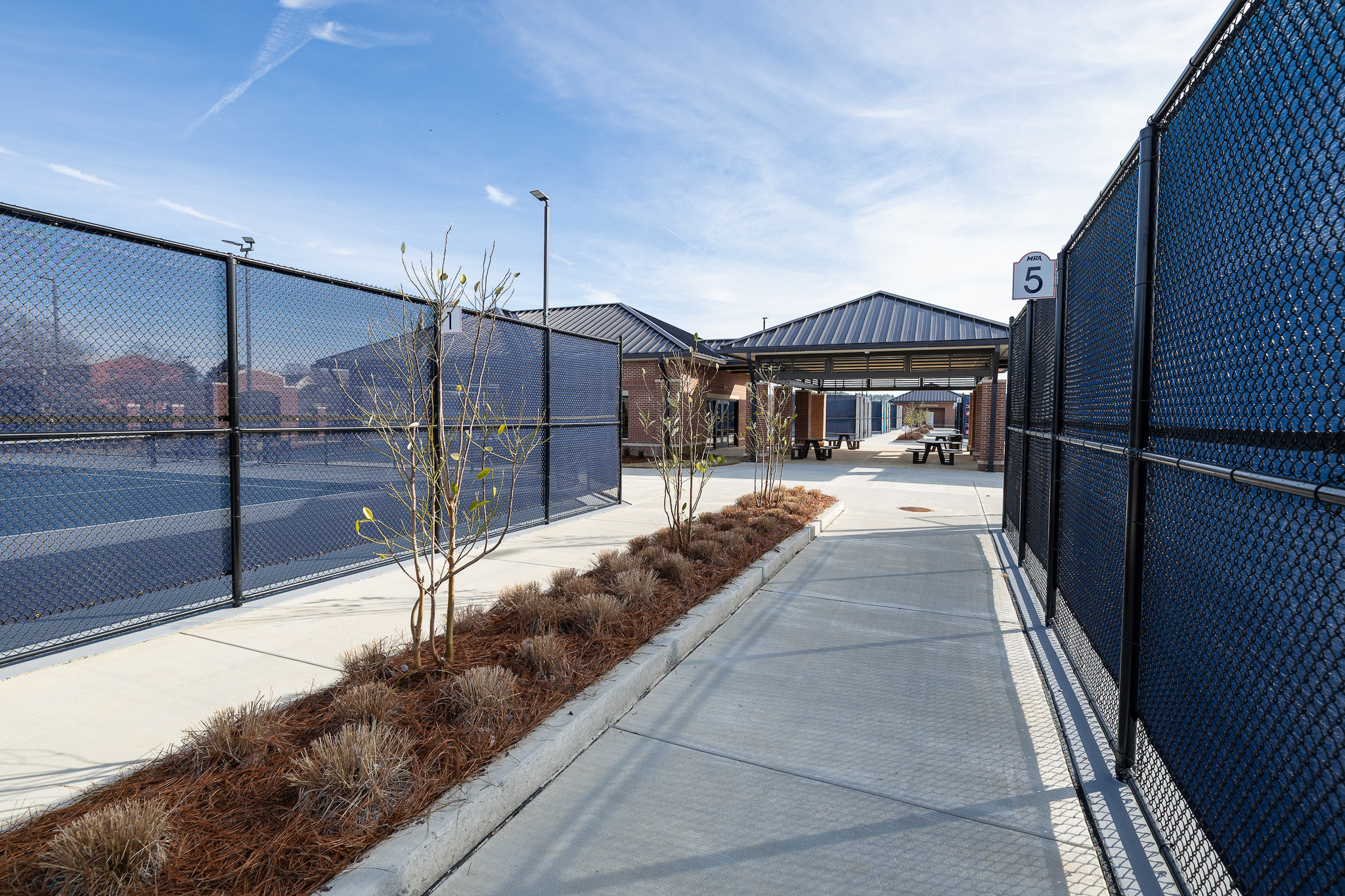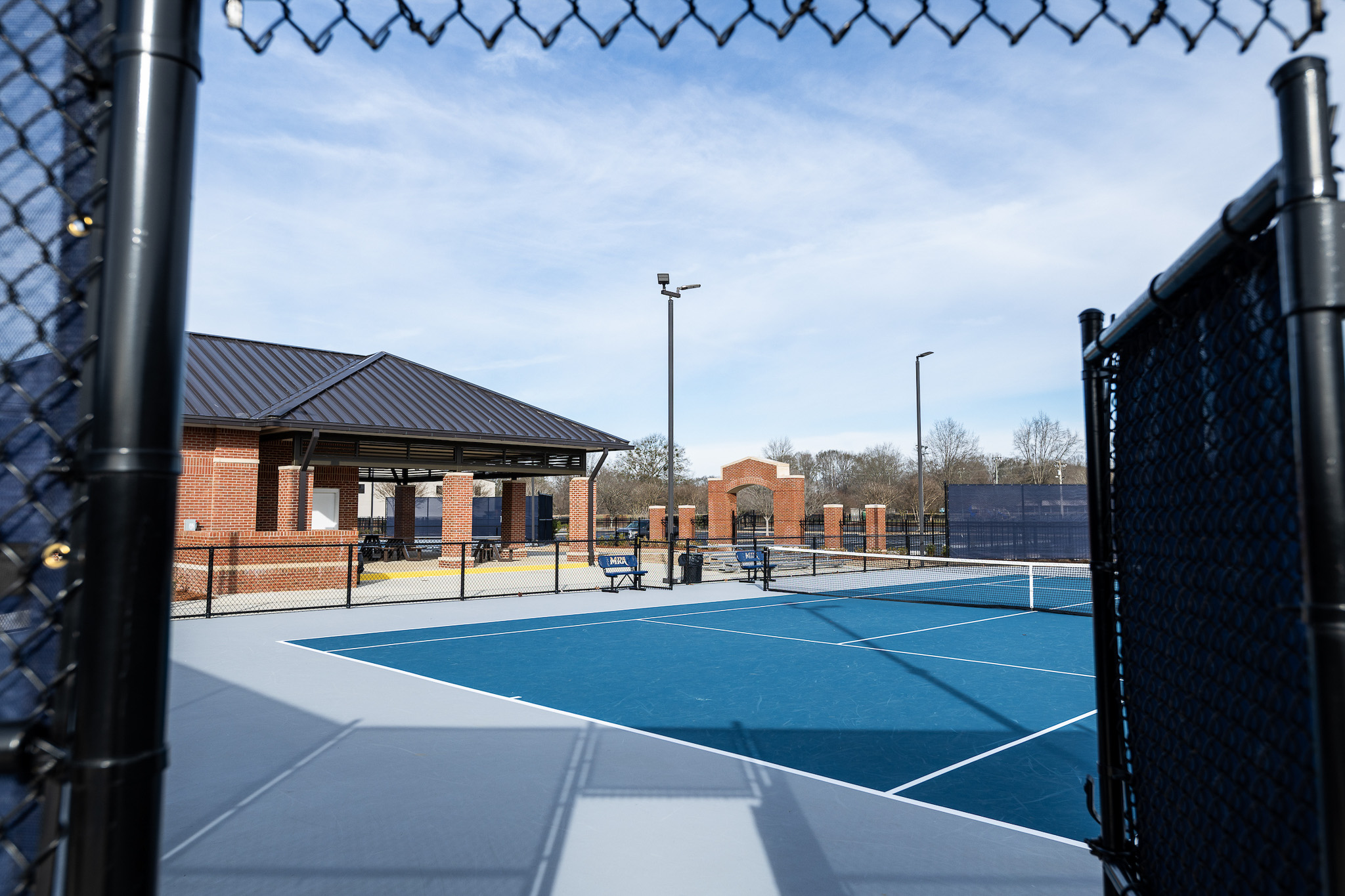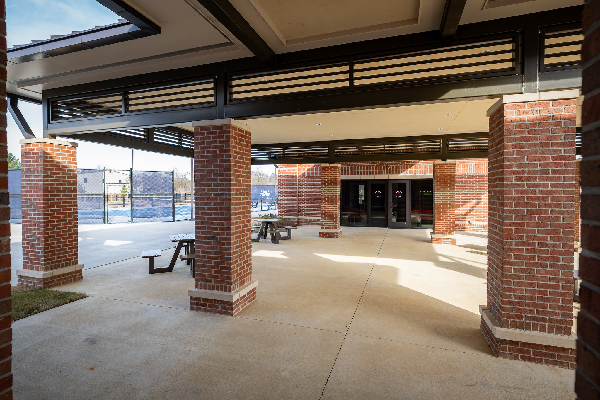 A central covered pavilion serves as the primary architectural element, physically and visually linking team meeting spaces and locker rooms while establishing a strong sense of place.
