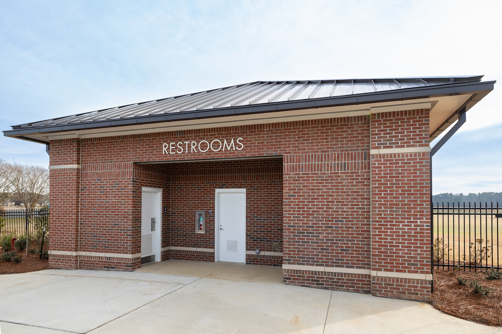 The material palette—brick veneer, stone accents, and standing seam metal roofing—draws directly from the existing campus, ensuring continuity while expressing durability and permanence through disciplined detailing.